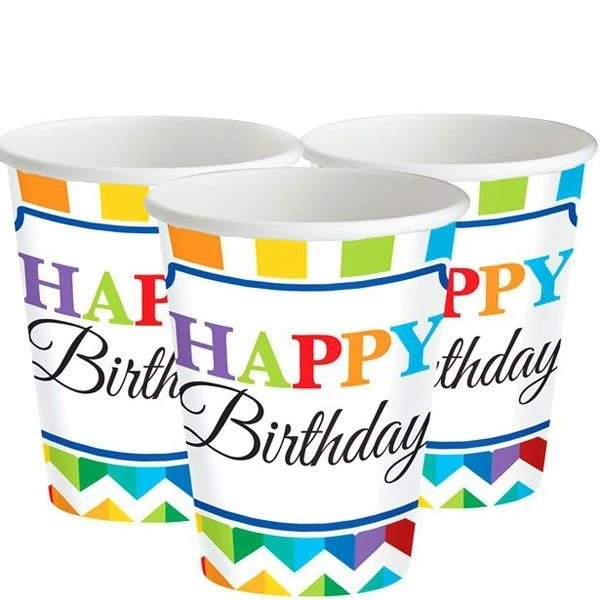 Kleurrijke kartonnen bekers met de tekst ‘Happy Birthday’. De bekers hebben een capaciteit van 266 ml en zijn verpakt per 8 stuks.