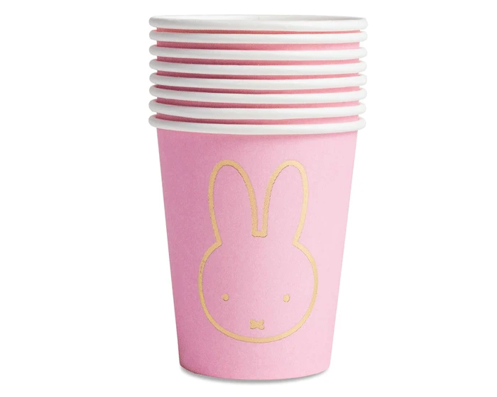 Schattige kartonnen bekers met een gouden Nijntje opdruk. Geschikt voor een babyshower, kraamfeest of verjaardagsfeest. Een verpakking bevat 8 bekertjes van 266 ml.