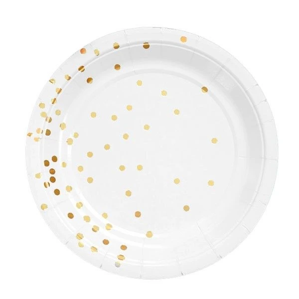 Kartonnen bordjes met gouden stippen in de kleur wit. De borden hebben een doorsnede van 18cm. Een verpakking bevat 10 borden.