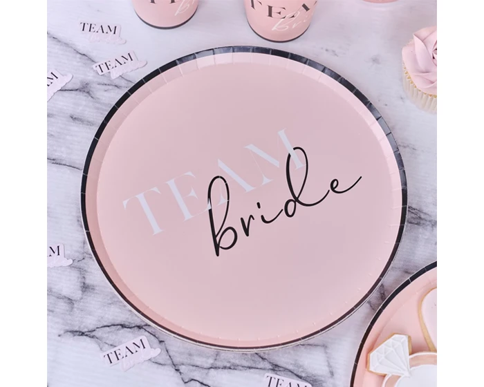 Serveer smakelijke lekkernijen voor vrijgezellenfeesten met deze chique Team Bride papieren borden van Ginger Ray. Elke verpakking bevat 8 Team Bride borden met een diameter van 25 cm.