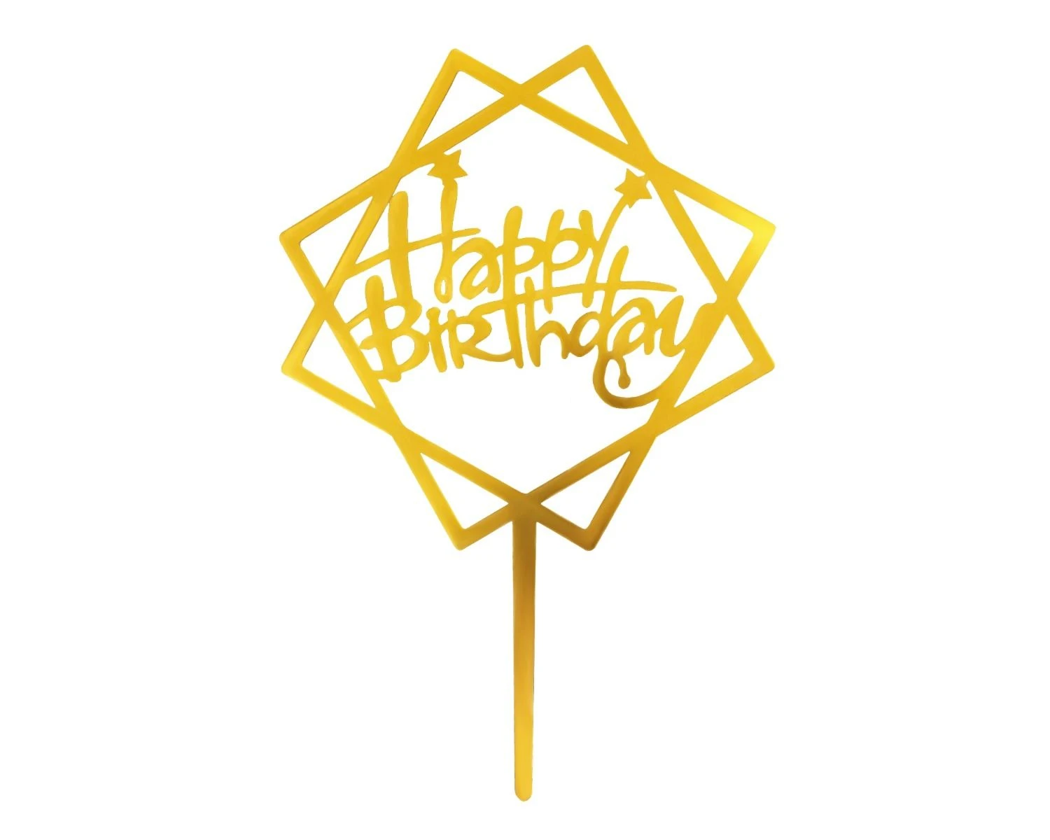 Gouden achthoekige caketopper met in het midden de tekst ‘Happy Birthday’. De caketopper is 16 cm hoog en 10,5 cm breed.