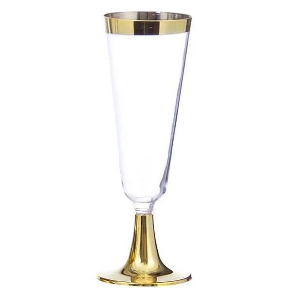 Plastic champagneglazen met metallic gouden rand en voet. Deze champagneglazen geven een extra luxe tintje aan je feest!