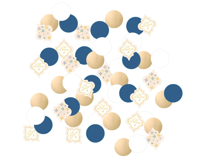 Papieren Eid Mubarak confetti in de kleuren goud, blauw en wit. Elke verpakking bevat ongeveer 14 gram confetti. Leuk om over tafel te strooien.