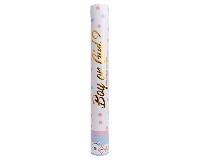Confetti kanon met lichtblauwe confetti van papier. Perfect voor een gender reveal feestje. Draai gewoon aan de onderkant en wacht tot het kanon knalt! Kanon is 40 cm lang. Alleen voor buiten gebruik.Â