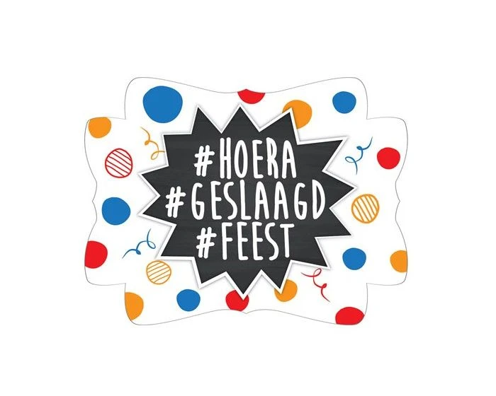 Een deurbord voor aan de wand of aan de deur met de tekst: #Hoera #Geslaagd #Feest