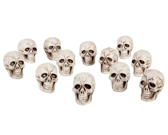 Zak met 12 doodshoofdjes met een afmeting van 4x3cm. Perfect om je huis mee te versieren voor Halloween!Â