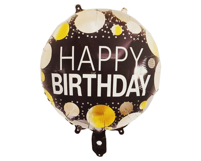 Zwarte folieballon met de tekst ‘Happy Birthday’. Verder is de ballon bedrukt met grote en kleine stippen. Leuk om te geven aan de jarige!