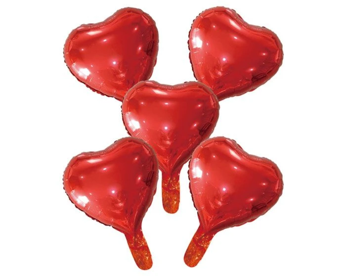 Set van vijf kleine hartjes folieballonnen in rode kleur. De ballonnen hebben een afmeting van ongeveer 23cm en kunnen met het bijgeleverde rietje opgeblazen worden. Let op: de ballonnen zijn niet geschikt om te vullen met helium.