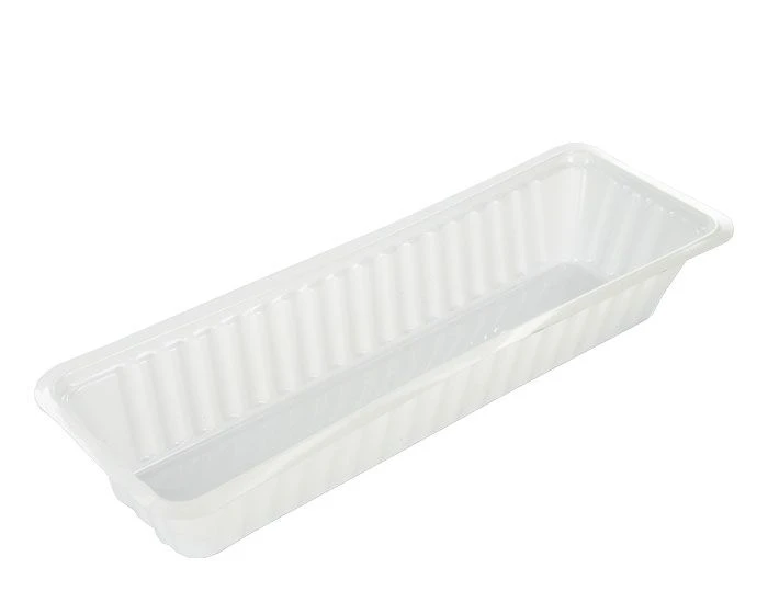 Witte langwerpige bakjes geschikt voor een frikandel, loempia, braadworst of andere snacks. Een verpakking bevat 250 bakjes.