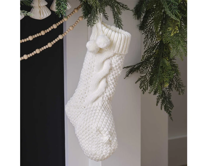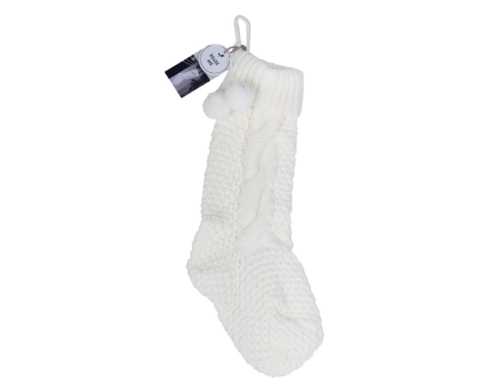 Hang deze prachtige crème/wit gebreide kerstsok klaar voor het bezoek van de kerstman! Elke verpakking bevat 1 kerstsok met twee hangende pompons van 45 cm (H) x 20 cm (B).