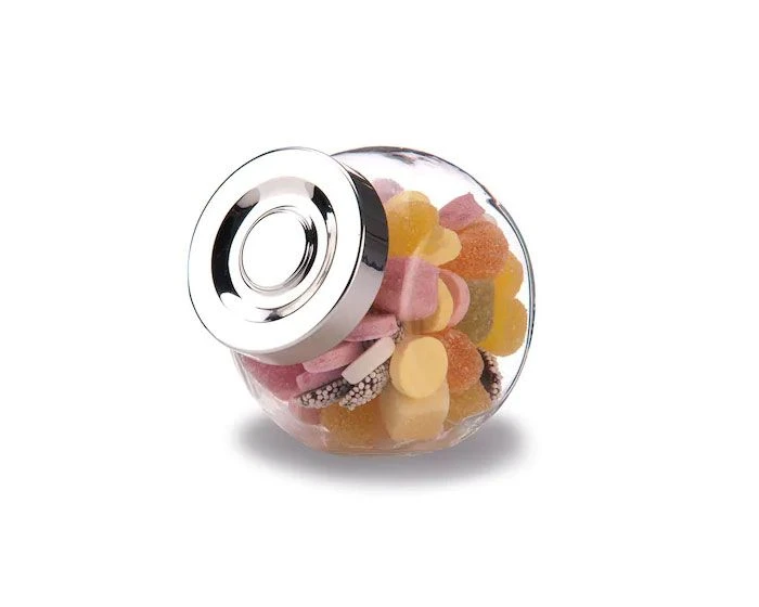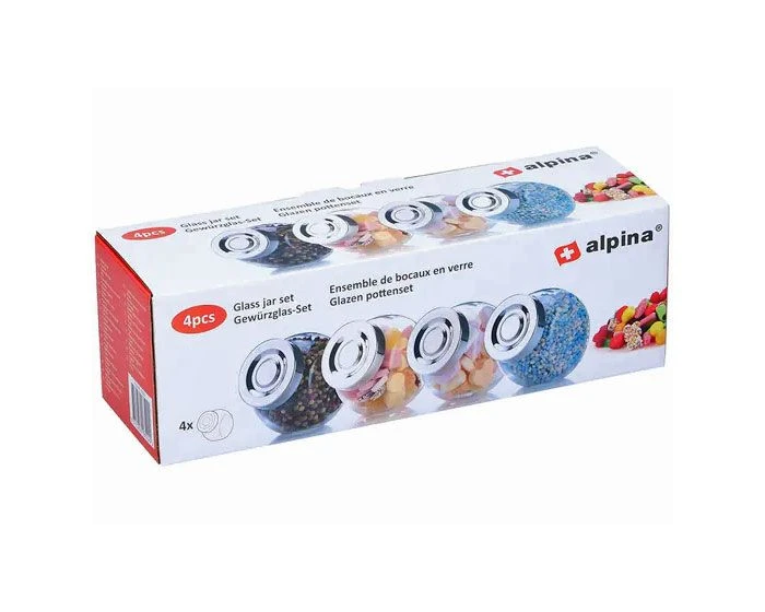 Set van vier glazen voorraadpotjes voor het bewaren van kruiden of snoepjes. De potjes hebben een inhoud van 200ml.Â