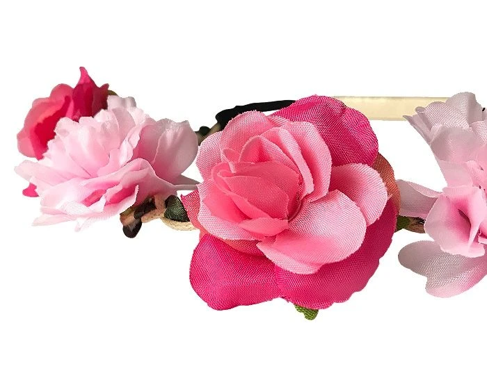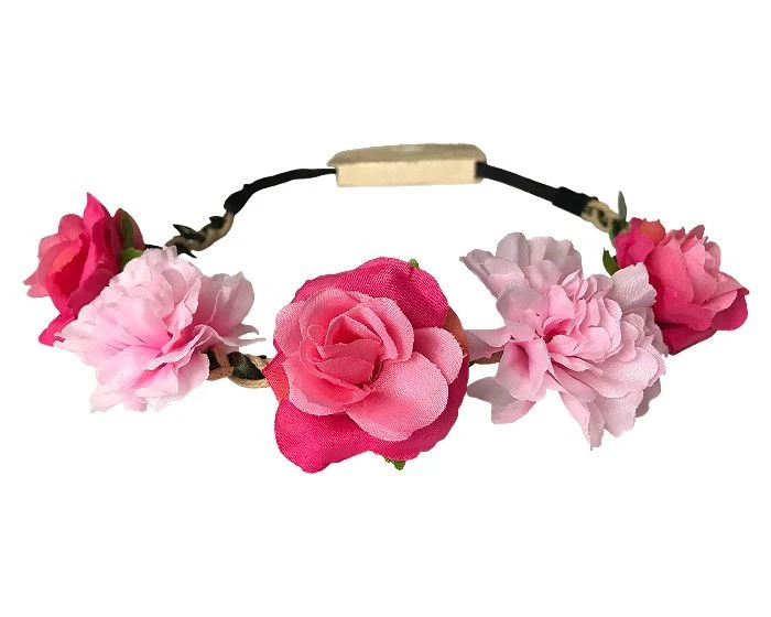 Mooie elastische haarband met vijf decoratieve bloemen van textiel in de kleuren fuchsia en roze. Leuk voor een thema- of verkleedfeest!