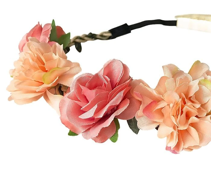 Mooie elastische haarband met vijf decoratieve bloemen van textiel in de perzikroze. Leuk voor een thema- of verkleedfeest!