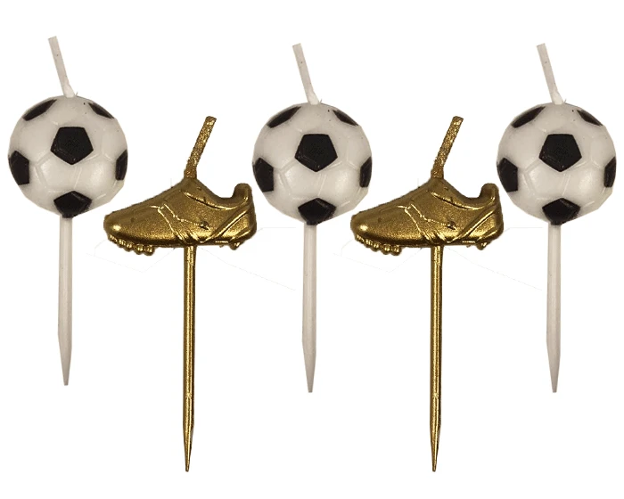 Kleine kaarsjes  in de vorm van een voetbal en schoen. Een set bestaat uit 3 voetbal kaarsjes en 2 schoen kaarsjes.Â