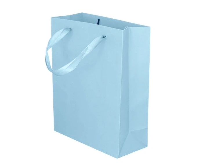 Middelmaat cadeautas van karton in het lichtblauw. De tasjes zijn 18 x 7,5 x 22 cm groot en verpakt per 12 stuks.