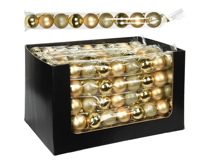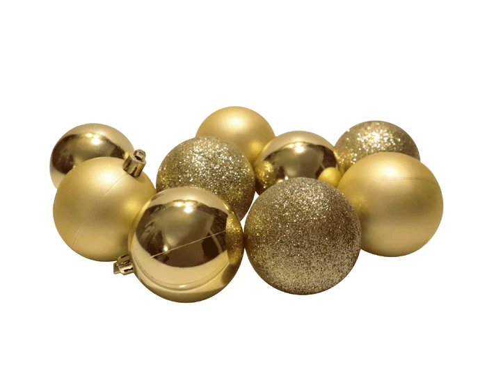 Set van 9 kerstballen in het goud, met elk een diameter van 6 cm. De set bevat matte, glazende en glitter kerstballen.