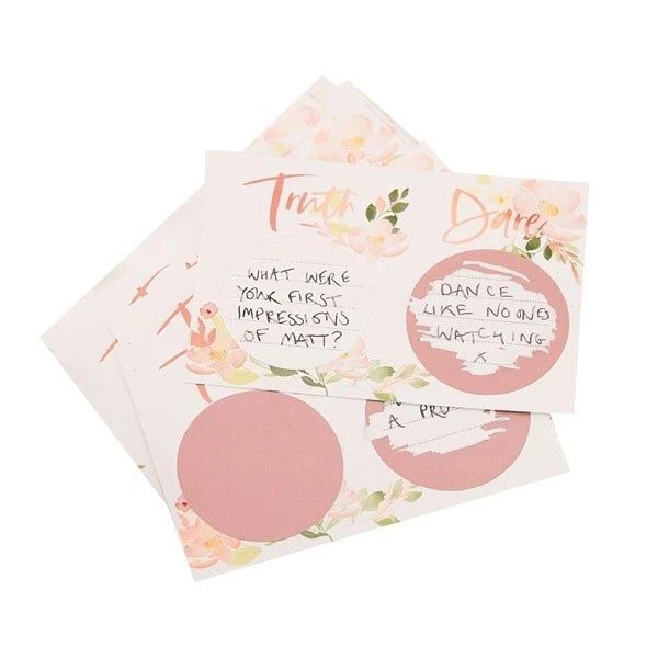 Speel dit leuke Truth or Dare spel tijdens het vrijgezellenfeest. Laat iedereen op de kaart waarheden en uitdagingen opschrijven en plak hier de uitkrasbare roze stickers over heen. Speel daarna het spel door de stickers open te krassen om de waarheid te onthullen of om een uitdaging voor te leggen. De verpakking bevat 25 kaarten en 50 stickers.
