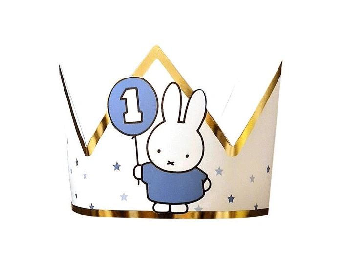 Schattige kartonnen kroontje met Nijntje erop. Eenvoudig verstelbaar in grootte. Leuk voor het eerste verjaardagsfeestje voor een jongen.