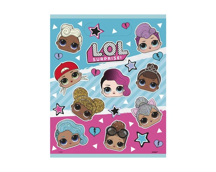 Vrolijke L.O.L. Surprise uitdeelzakjes om te vullen met bijvoorbeeld snoepjes en/of uitdeelspeelgoed. Ideaal voor een verjaardagsfeest van je dochter! De zakjes zijn 18,5 x 22,5 cm groot en verpakt per 8 stuks.Â