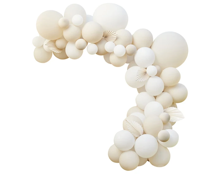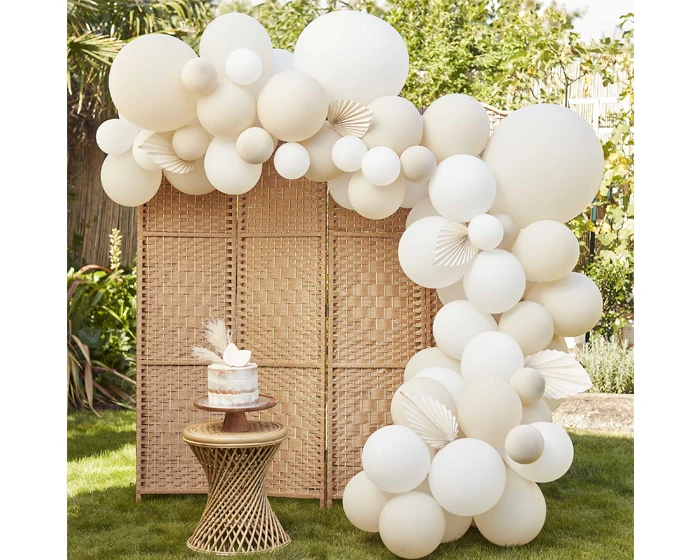 Creëer een prachtige backdrop op je feest met deze nude/beige en witte ballonnenboog set van Ginger Ray. Deze prachtige ballonnenboogset wordt compleet geleverd met 80 ballonnen en 5 papieren waaiers. Ook ontvang je 4 meter papieren ballontape, 40 lijmstippen en 3 meter wit touw meegeleverd voor eenvoudige montage. Latex ballonnen zijn biologisch afbreekbaar en de verpakking is recyclebaar en FSC-gecertificeerd.