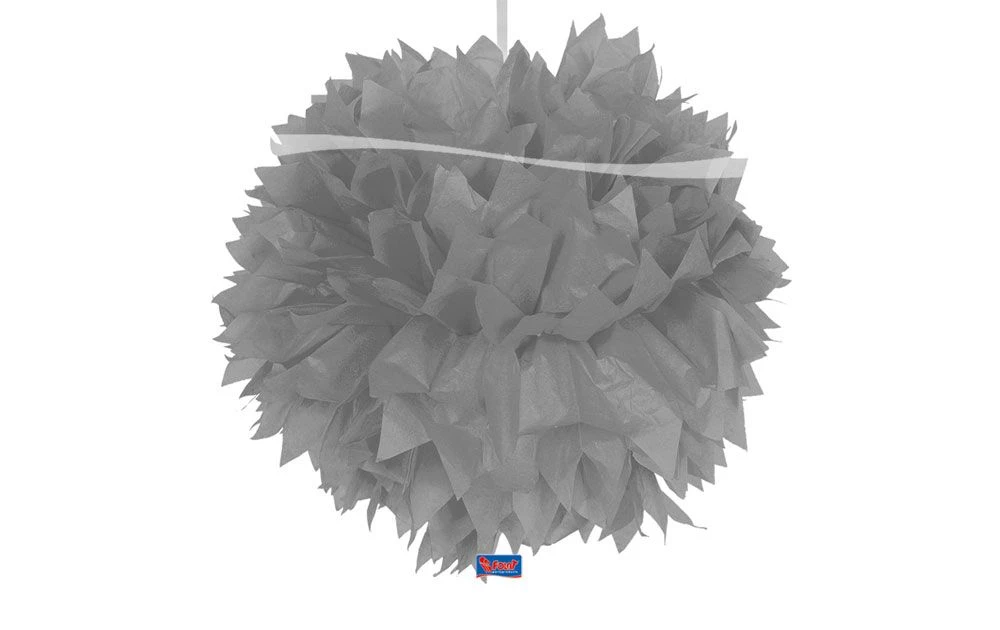 Papieren decoratie pompom in het grijs. De pompom heeft een diameter van 30 cm en bestaat uit 10 vellen tissuepapier met ronde hoeken. Makkelijk om uit te vouwen.