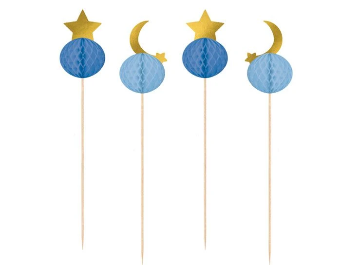 Een set van tien lange prikkers met ronde honeycombs in donker- en lichtblauwe kleur. Boven de honeycomb zit een ster of een maan. Leuk om bijvoorbeeld hapjes of taart mee te versieren tijdens Eid Mubarak.Â