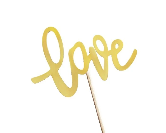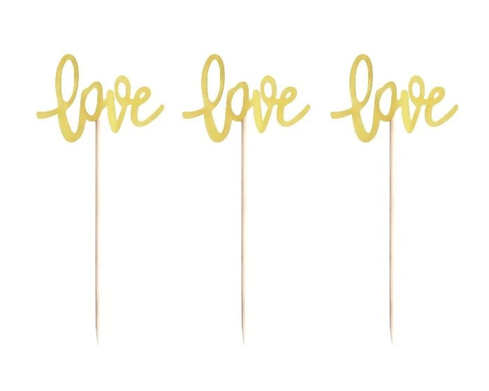 Prikkers met de tekst ‘Love’ in het goud. De letters zijn gemaakt van papier. De prikkers zijn circa 11cm hoog en verpakt per 12 stuks.Â