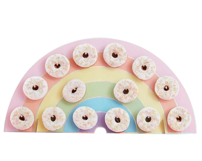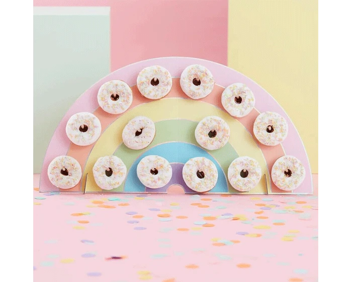 Kleurrijke donut wall in de vorm van een regenboog. Een leuke eyecatcher op elk feestje! Aan de donut wall kan je 14 stuks donuts ophangen.Â