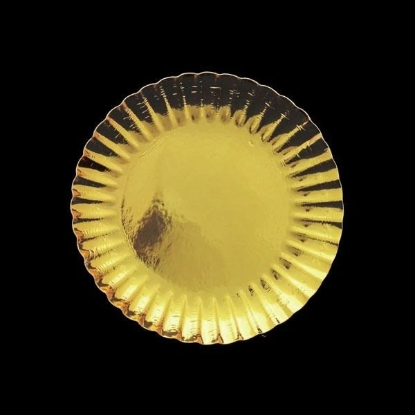 Schotel van karton met een geribbelde rand in het zilver of goud. Dit bordje heeft een dia van ca. 12,5cm en is per 20 stuks verpakt.