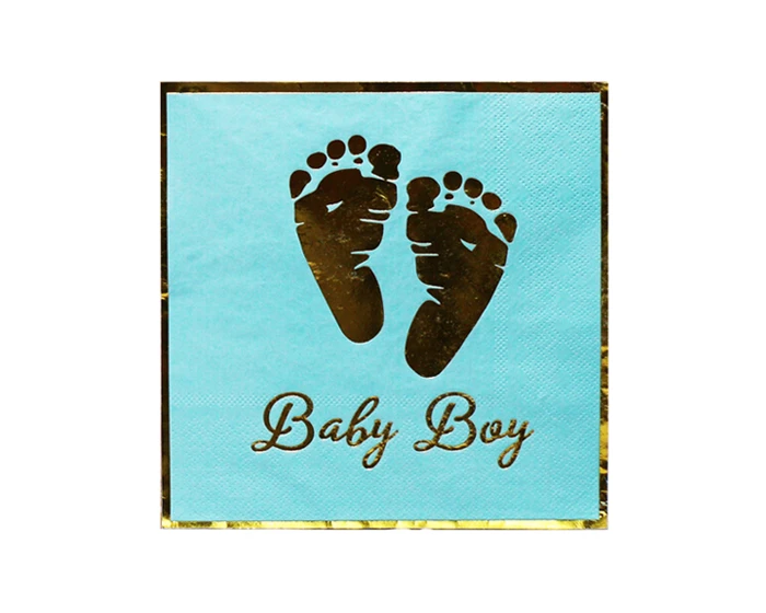 Luxe blauwe servetten met een afdruk van babyvoetjes en de tekst ‘Baby Boy’ in goudfolie. De servetten hebben uitgevouwen een afmeting van 33x33cm. Elke verpakking bevat 20 servetten.