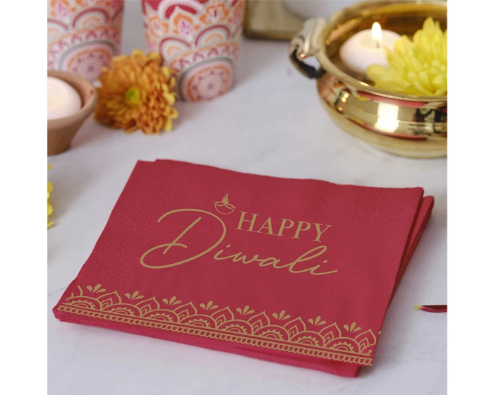 Prachtige servetten bedrukt met de tekst ‘Happy Diwali’, speciaal voor het lichtjesfeest of Divali feest. Een verpakking bevat 16 servetten met een afmeting van 16x16cm.