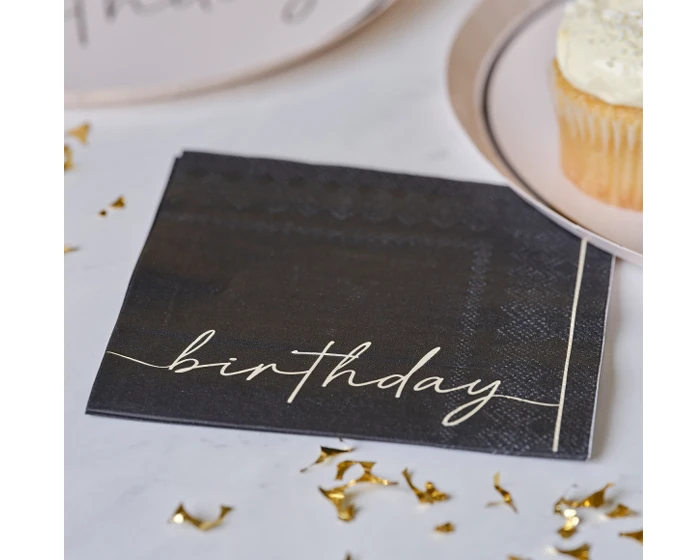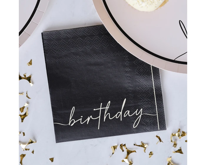 Vier je verjaardag in stijl met deze luxe Happy Birthday servetten van Ginger Ray in zwart en nude kleuren. Elke verpakking bevat 16 servetten met een afmeting van 12,5×12,5cm.