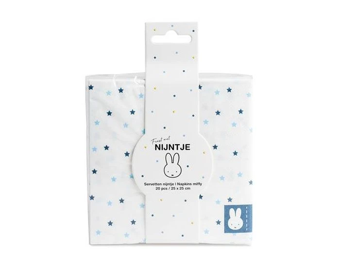 Schattige Nijntje servetten met blauwe stippen. Leuk bij het serveren van hapjes en/of beschuit met muisjes. Eén verpakking bevat 20 servetten van 25x25cm.Â