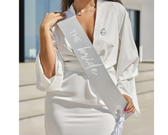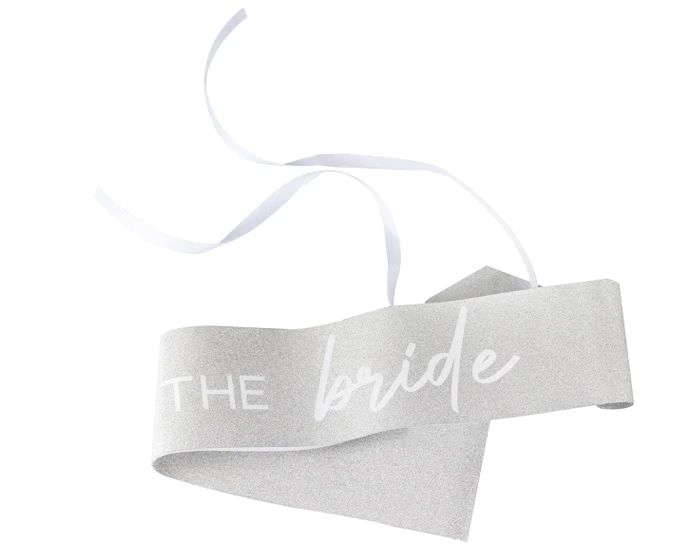 Laat de aanstaande bruid zich extra speciaal voelen met deze zilverkleurige The Bride sjerp van Ginger Ray. Elke verpakking bevat 1x bruidssjerp van 1m lang met wit lint.Â