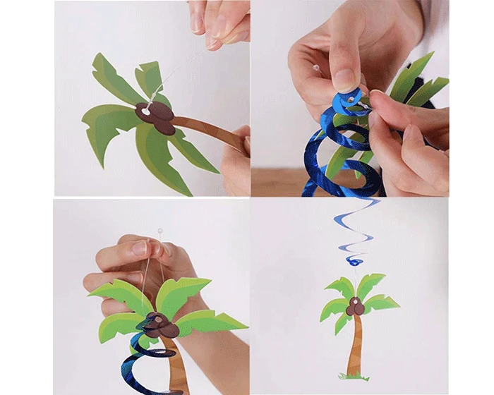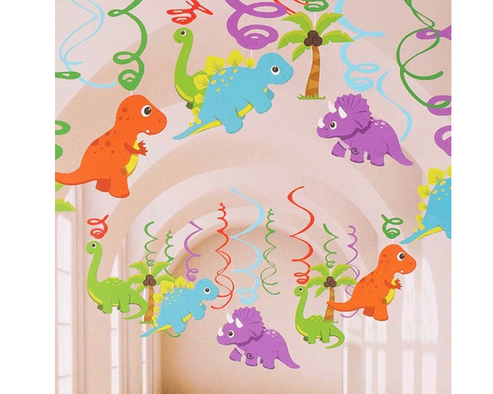 Feestelijke swirl decoratie met dinosaurussen. De verpakking bestaat uit 12 gekleurde folie swirls, 6 afbeeldingen van dinosaurussen en tie rips.