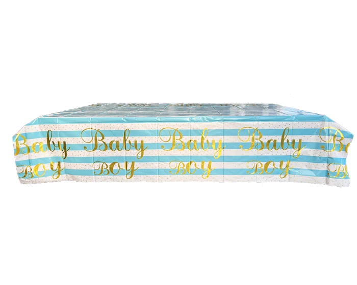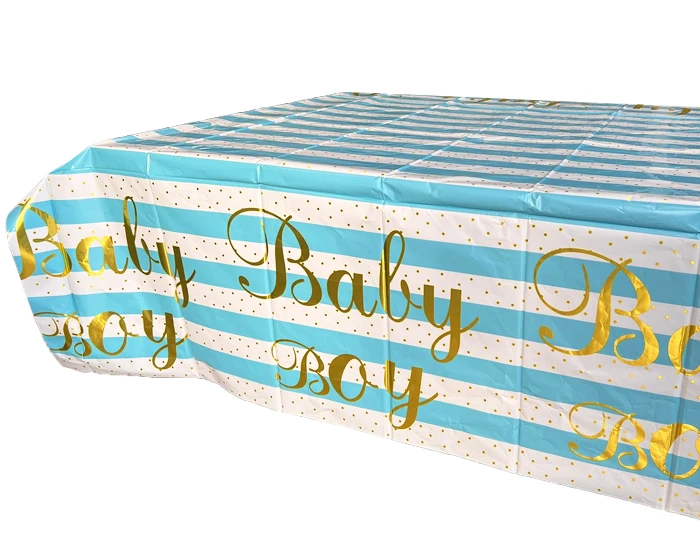 Plastic tafelkleed met de tekst ‘Baby Boy’ in het goud. Verder is de tafelkleed gestreept in blauw en wit en heeft het goude stippen. De tafelkleed heeft een afmeting van 137x183cm. Perfect voor een blauwe babyshower.