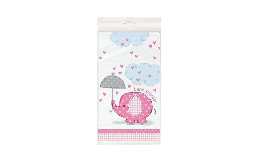 Baby Shower tafelkleed met olifantjes en wolkjes in het roze. Het tafelkleed is 1,37 x 2,13 meter groot.