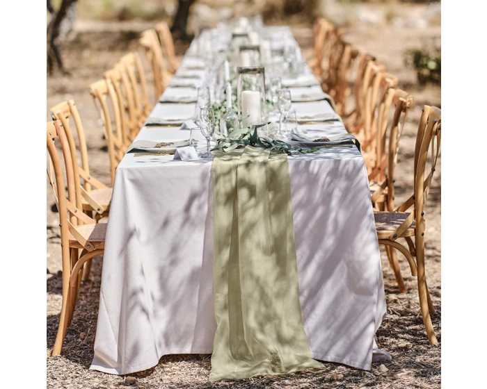 Decoreer de tafels met deze elegante saliegroene tafelloper van Ginger Ray. Drapeer hem over de tafel en stijl het af met kaarsen en groene takken. Deze saliegroene stof zou je ook op andere manieren kunnen gebruiken, bijvoorbeeld gedrapeerd over een decoratieframe. Op beide manieren kan deze mooie stof een ruimte een prachtige uitstraling geven, of het nu gaat om de ceremonie of receptie. De saliegroene tafelloper is 4m lang. We raden aan om de stof lichtjes bij elkaar te leggen voor het mooiste effect.