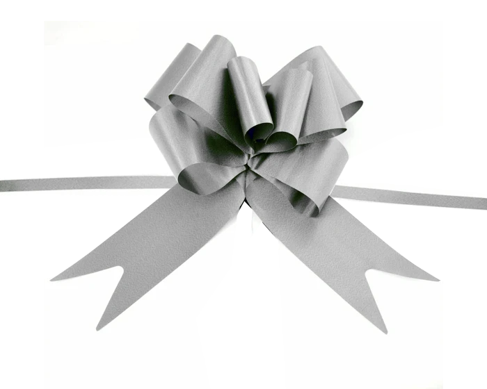 Grote maat treklint in het zilver, voor het versieren van je bedankje of gewoon op een cadeau. Het lint is 49x900mm groot in platte vorm. Verpakt per 10 stuks.