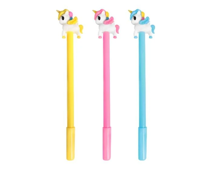 Softplastic unicorn pennen met een fijne blauwe punt. De pen is 18,5 cm lang. Een pak bevat 3 pennen. De kleuren van de pennen kunnen per pak verschillend zijn.