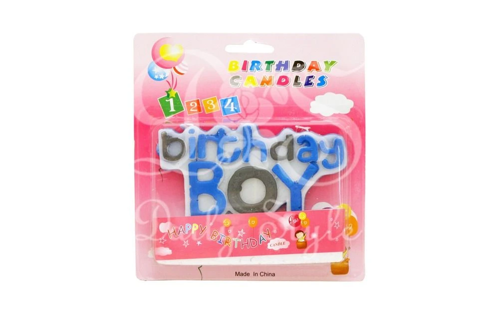 Verjaardagskaars met de tekst ‘birthday BOY’. De kaars heeft een afmeting van 12,2 x 1 x 6,5 cm.