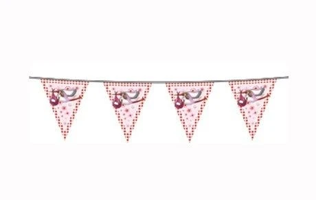 Vlaggenlijn voor de geboorte van een meisje. De vlaggenlijn is 10m lang en de vlaggetjes hebben een lengte van 30cm. Op een vlaggenlijn hangen 15 vlaggetjes.
