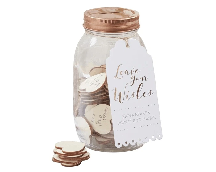 Glazen wenspot als alternatief voor een gastenboek. Laat de gasten een mooie boodschap voor jullie schrijven op jullie grote dag. De set bestaat uit 100 houten hartjes en een glazen pot. De pot heeft een doorsnede van 9 cm en is ca. 17 cm hoog. De hartjes hebben een doorsnede van 3,9 cm.Â